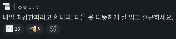 어제부터 내일 엄청 춥다고 하니까 모두 조심하라며 여기저기서 알람이 울렸다.