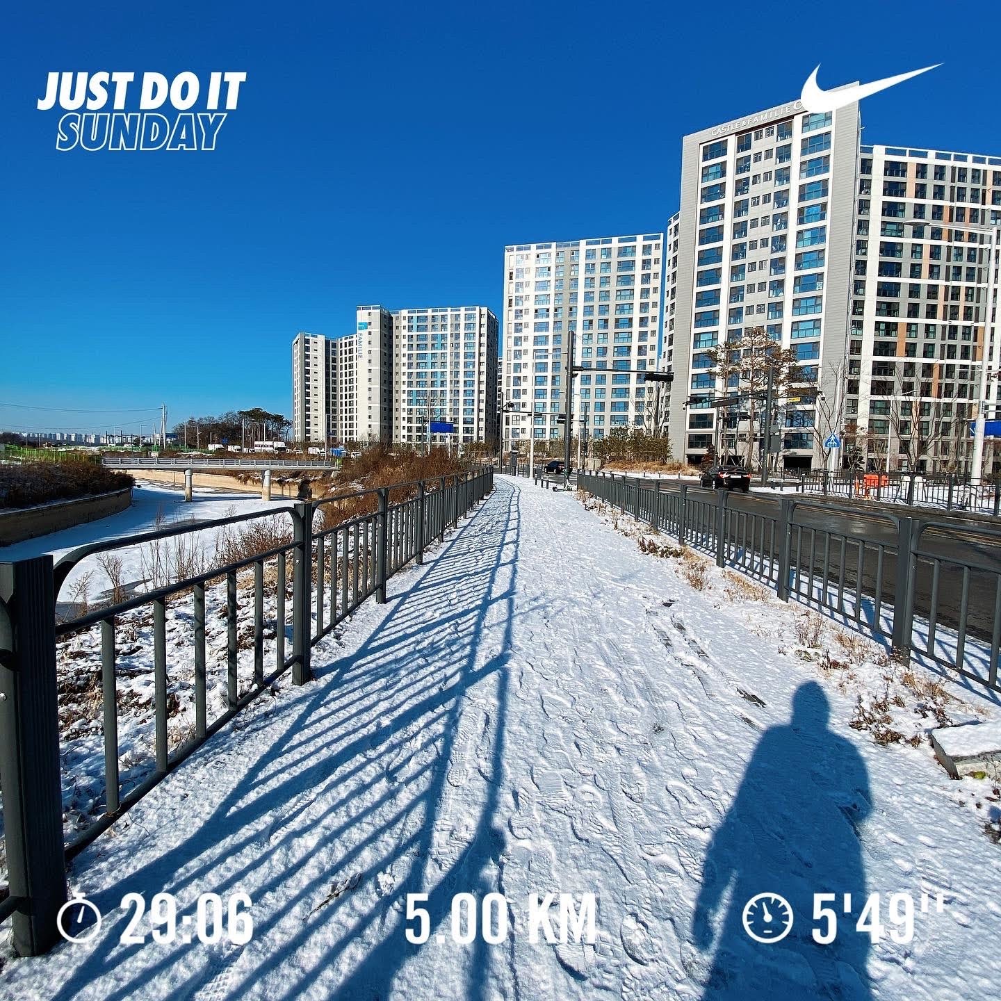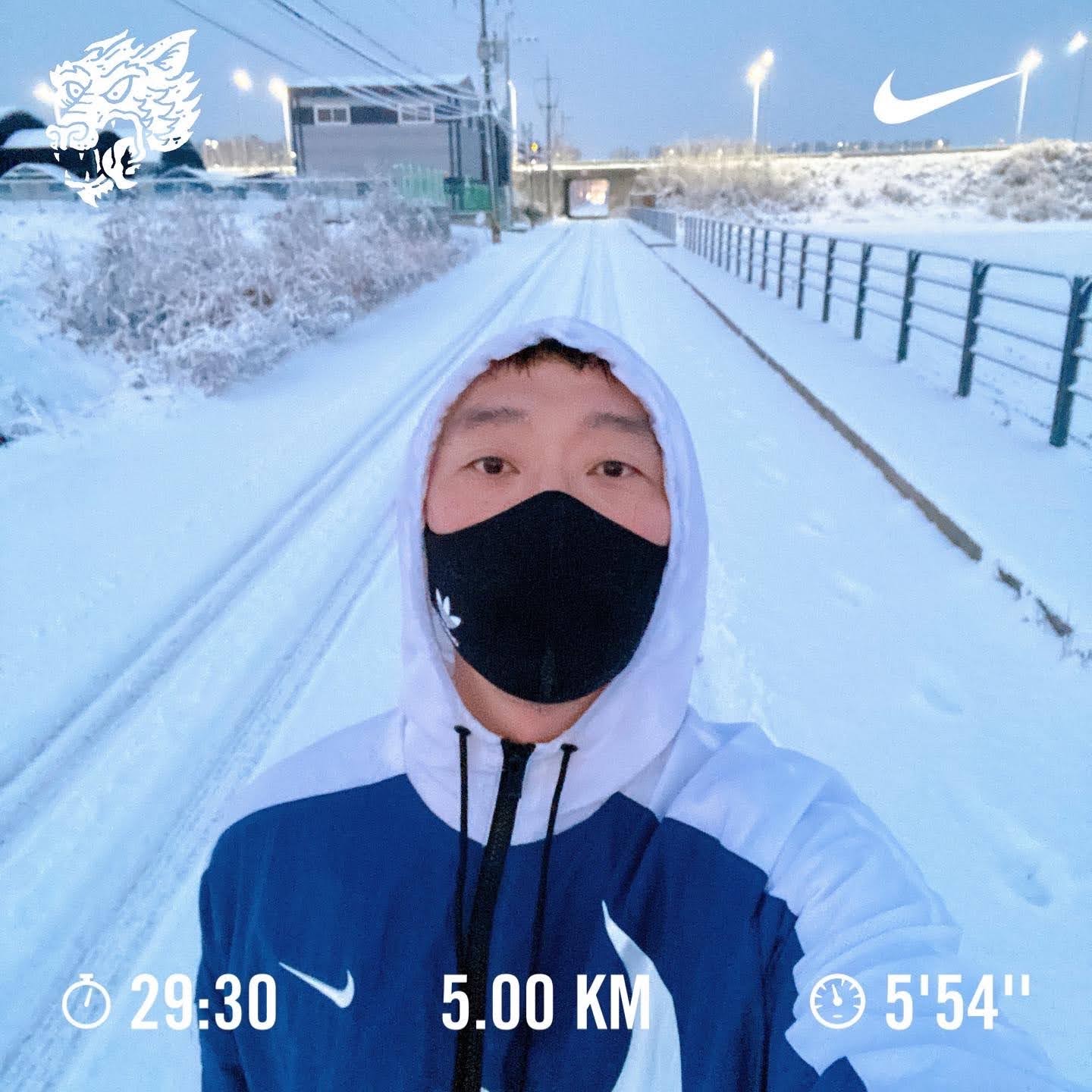 처음 눈 위를 달렸다. 눈이 오더라도 절대 달리기는 패스하지 않기로 했다.