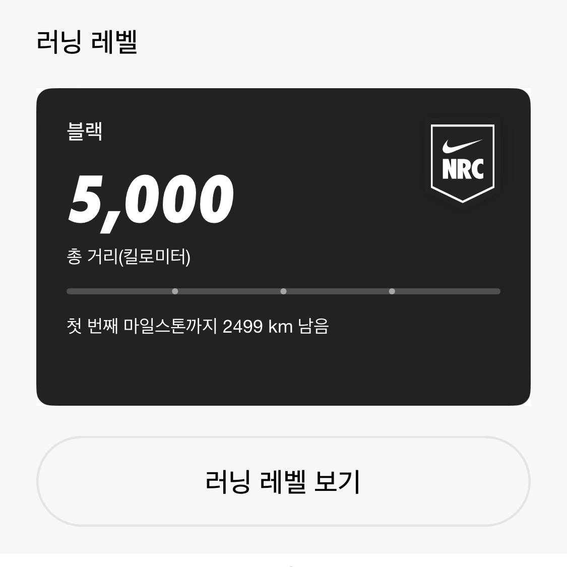 나이키의 달리기 앱 NRC(Nike Running Club)는 누적 마일리지에 따라 사용자에게 달리기 레벨을 부여한다. 최고 레벨은 누적 마일리지 15,000K를 달성했을 때 주어지는 VOLT 레벨이다. VOLT 레벨 바로 전 단계인 BLACK 레벨을 달성했다.
