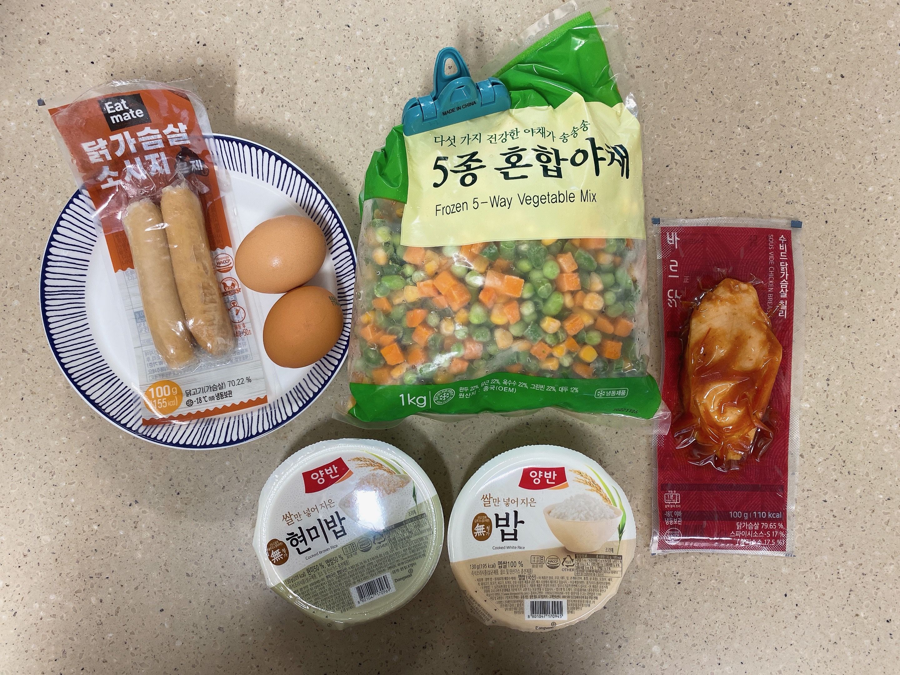 그러면 벌써 기본적으로 닭가슴살 소시지와 계란으로 단백질 함유량이 좀 되는데 여기에다가 소스가 함께 들어있는 통닭가슴살로 토핑한다.
