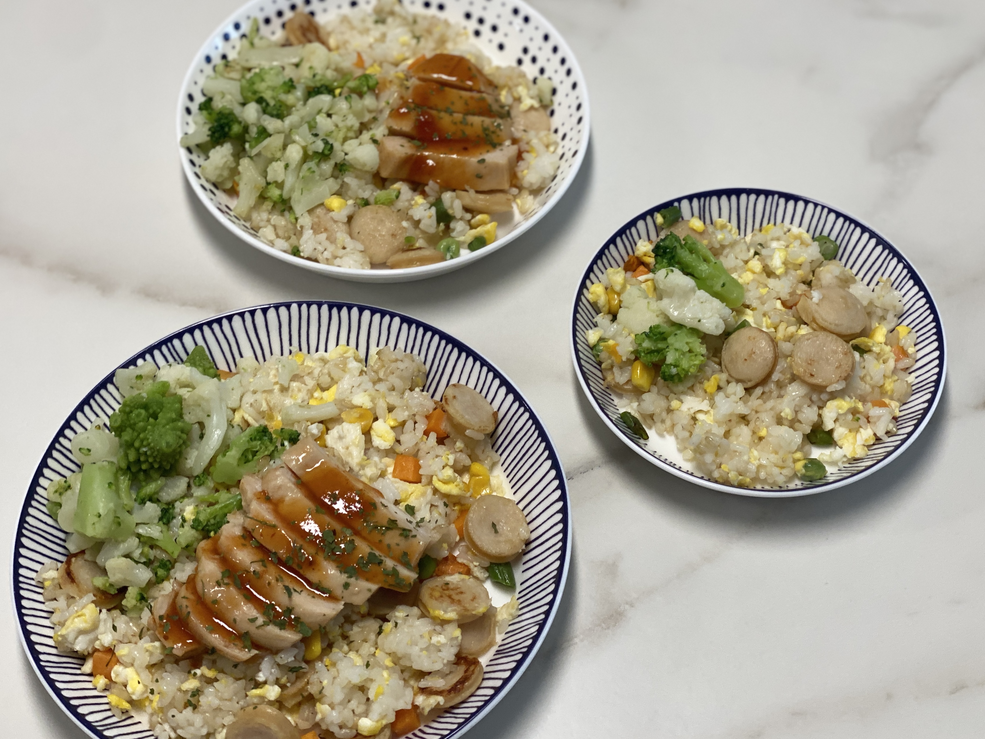 야채와 소시지를 같이 볶으면서 계란도 같이 넣어서 섞어준다. 밥은 흰밥과 현미밥을 한 개씩 투하해서 믹스한다.
