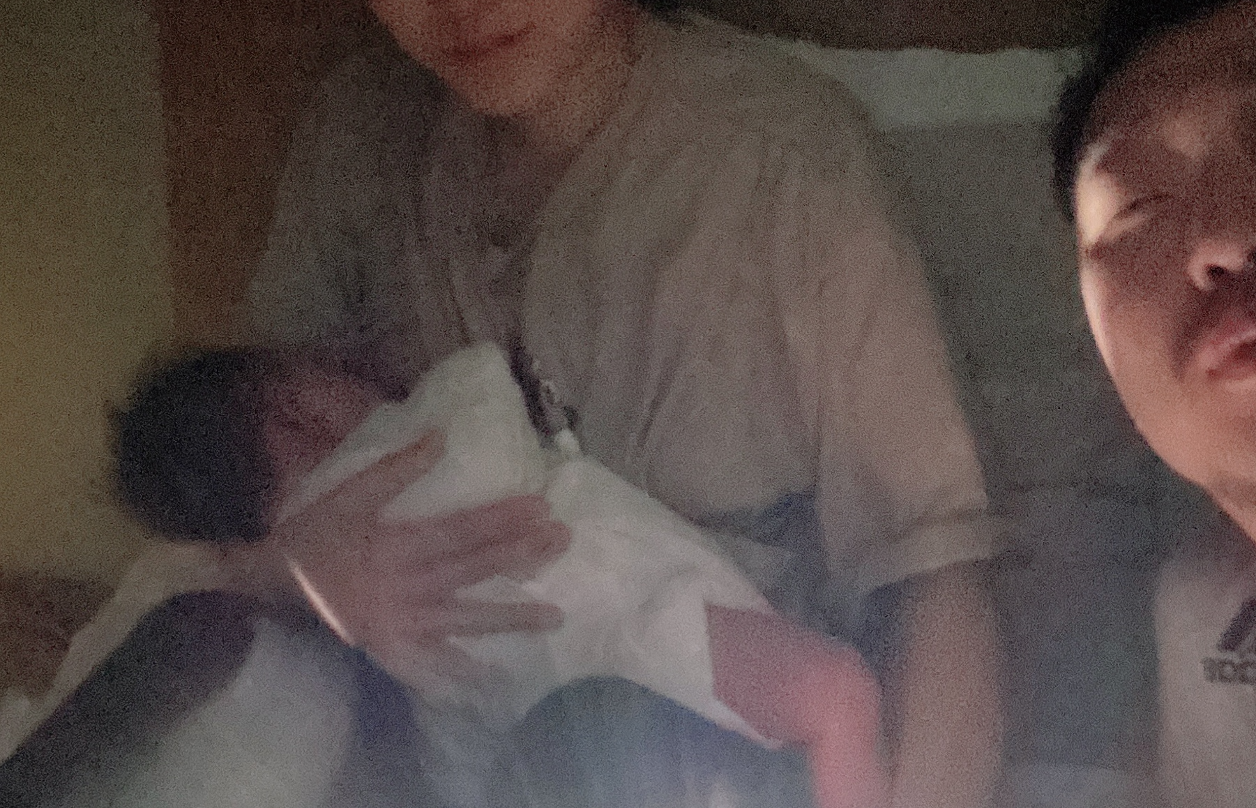 역시 해보지 않으면 모르는 것 같다. 해보니까 알겠다. 왜 신생아 엄마, 아빠들이 아침에 머리에 새집을 하고 두 눈은 동공이 풀린 초점 없는 눈을 하고 있는지 말이다. 우리가 딱 그랬다. 무슨 정신이었는지도 모르겠지만 5시 타임에 깼을 때 우리 모습을 한 장 남겨두고 싶었는지 셀카를 한 장 찍었다. 우리 세 식구가 다 같이 집에서 보낸 첫 날밤의 사진이었다.
