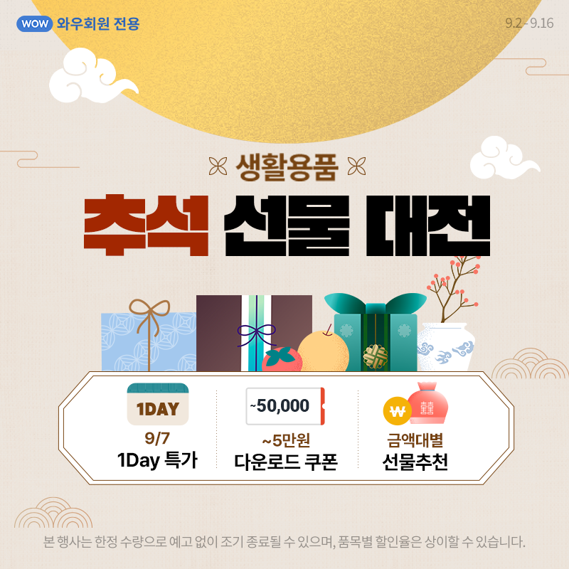 행복하고 풍성한 추석 보내시길 바라며, 이번 추석 선물 대전을 통해 알뜰하고 현명한 쇼핑되시길 바랍니다!