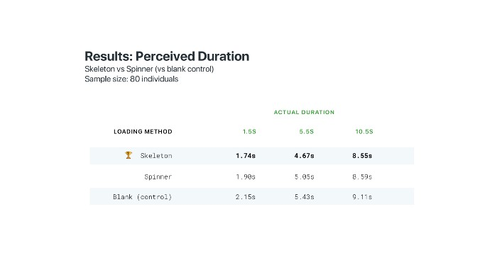 아래의 표는 80명의 참가자를 대상으로 스켈레톤, 스피너, 블랭크 화면을 보여주며 테스트 했을 때 인지되는 로딩 시간을 보여줌. 결과적으로 블랭크 페이지 < 스피터 < 스켈레톤 순서대로 더 빠르다고 느끼게 됨.