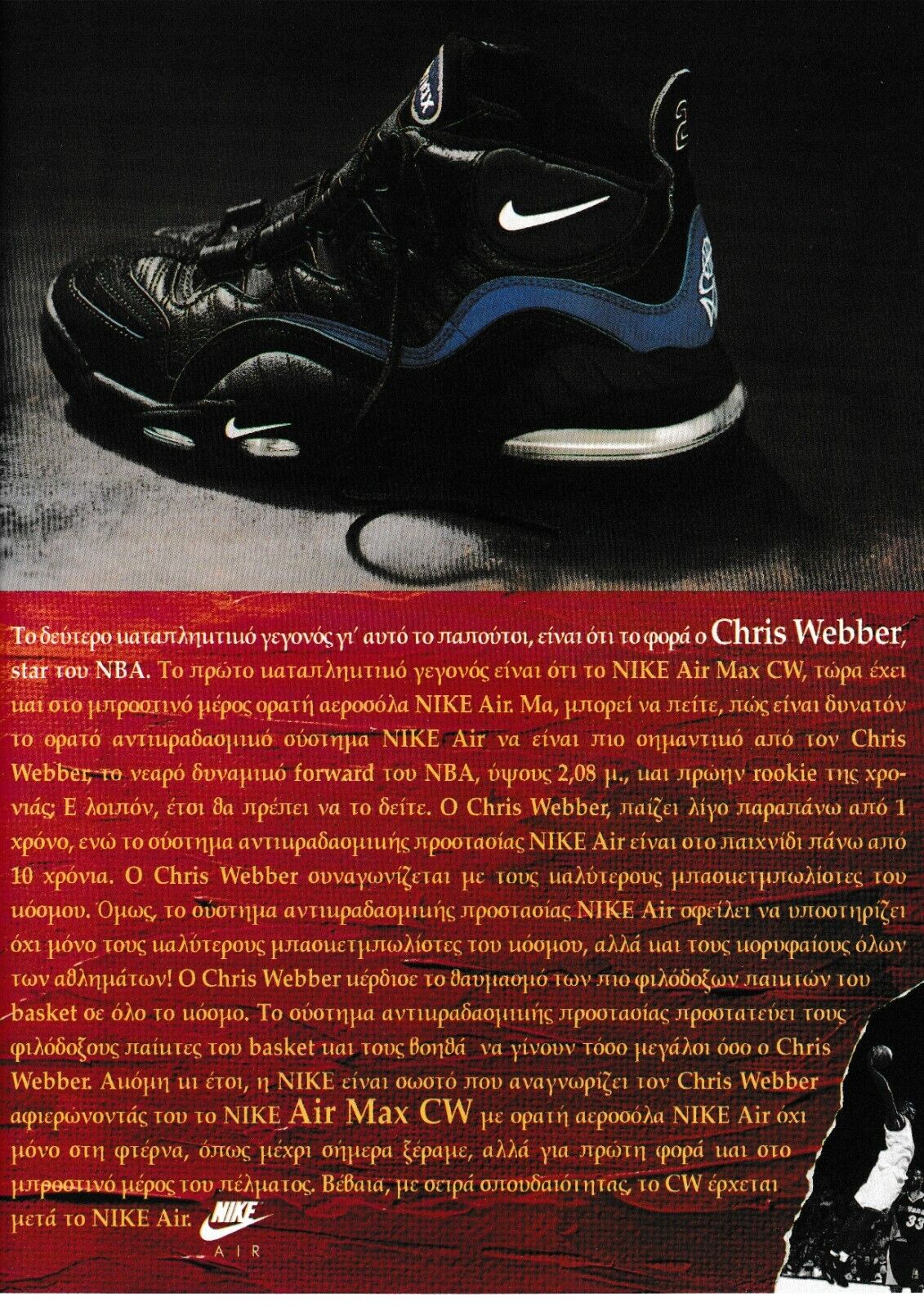 한쪽은 형광 옐로우 색상의 에어맥스 95, 다른 한쪽은 당시 핫했던 NBA 신예 크리스 웨버의 약자를 딴 그의 시그니처 농구화 CW였다. 두 신발 모두 당시에 가장 핫한 멋진 운동화 중 하나였다.