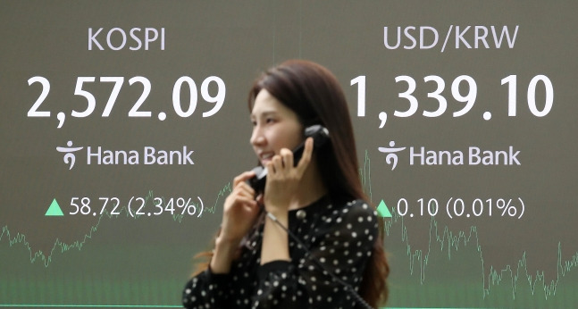 12일 오후 서울 중구 하나은행 본점 딜링룸 전광판에 증시 종가가 표시되고 있다. 이날 코스피 지수는 전 거래일 대비 58.72포인트(2.34%) 오른 2572.09, 코스닥 지수는 21.61포인트(3.05%) 상스앟ㄴ 731.03으로 장을 마감했다./뉴스1